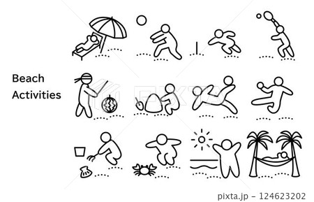 夏のビーチで遊ぶ人のシンプルアイコンセット