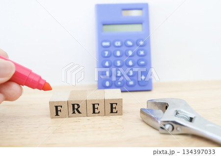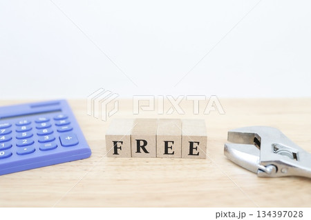 工事費無料や見積無料を示す工具と無料ブロックの写真。