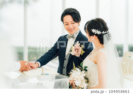 結婚式で結婚証明書・結婚誓約書にサイン・署名をする新郎新婦