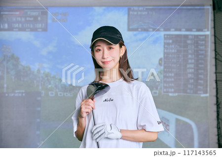 室内ゴルフ練習場で練習をする女性