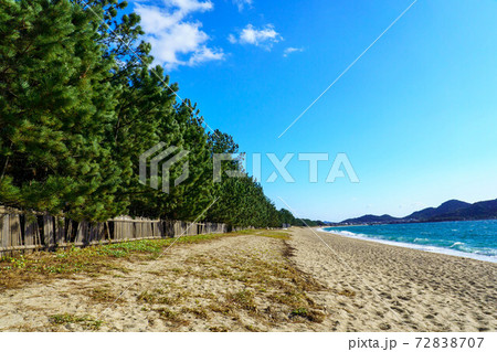 白砂と白波が続く室積海岸。西方向を望む(山口県光市)