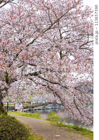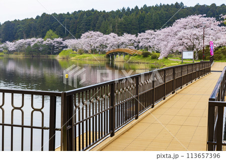 宮城平筒沼ふれあい公園の浮橋と満開の桜並木