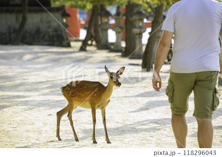 観光客に近寄っていく厳島神社のニホンジカ(広島県廿日市市宮島町)