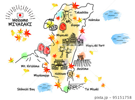 秋の宮崎県の観光地のシンプル線画イラストマップ