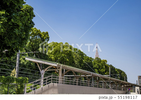 日本の東京都市景観 電車や原宿駅「宮廷ホーム」などを望む