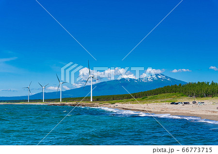 宮海海水浴場脇の風力発電と鳥海山 山形県酒田市
