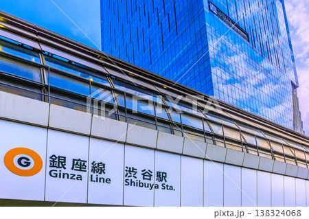 日本の東京都市景観 東京メトロ銀座線渋谷駅や電車、渋谷スクランブルスクエアなどを望む