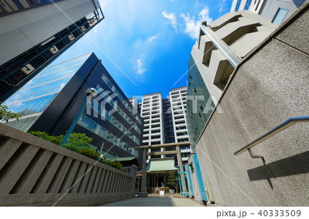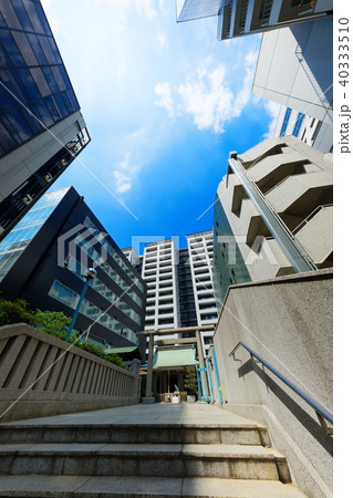日本の東京都市景観 渋谷宮益坂に鎮座する宮益御嶽神社。旧宮益町の鎮守。珍しい日本狼の狛犬は人気だ