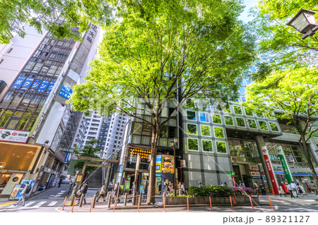 日本の東京都市景観 新緑に映える宮益坂や宮益御嶽神社などを望む。左奥は宮益坂下、渋谷駅方向