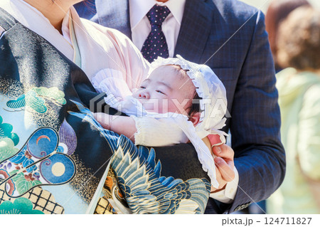 お宮参り(初宮詣)のお祝いでお母さんに抱かれる赤ちゃん