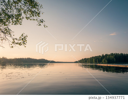 Serene lake landscape at sunset with wooden pier, forest coastline and golden sunlight reflecting on calm water