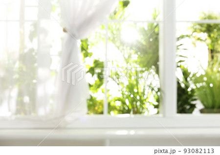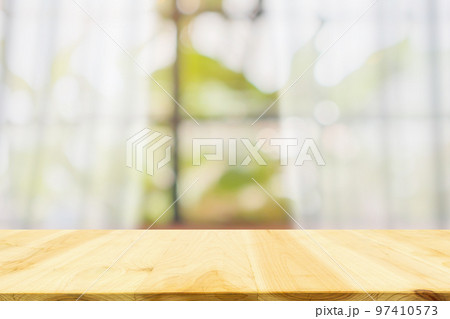 Empty wood table top with blur white curtain window and green garden background for product display template
