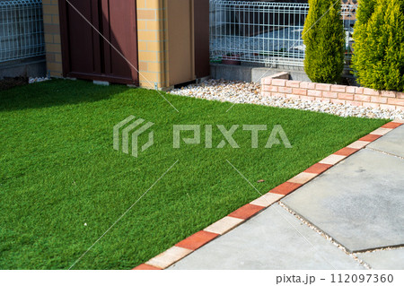 人工芝のある庭のある家