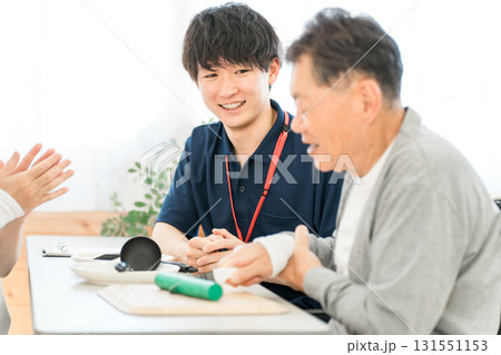 シニア男性のリハビリをする作業療法士,ケアマネージャーの男性スタッフ