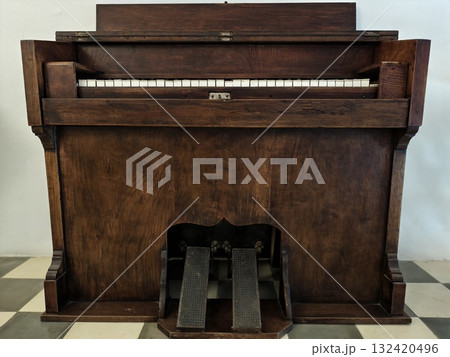 vintage oak upright with brass pedals, solid oak upright piano featuring rich grain and brass pedals