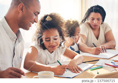 Family, education and parents help children with homework. learning and growth with writing at home. Mother, father and girl kids with activity, people in dining room with studying and development