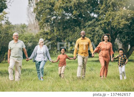Portrait, holding hands and happy family at a park walking, bond and having fun in nature together. Love, smile and children with parents, grandparents and freedom, support and trust on forest walk