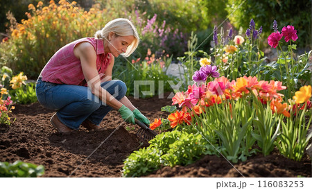 Woman in pink shirt and jeans working in garden among bright flowers while enjoying sunny day.