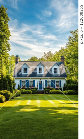 White colonial house with a large green lawn under a blue sky, suburban living concept