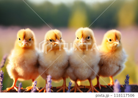 Portrait of small baby chickens on an old stone fence with lavender flowers, on a ranch in the village, rural surroundings against the background of spring nature