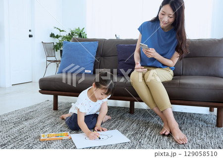 子どもがお絵かきをする横でスマートフォンを