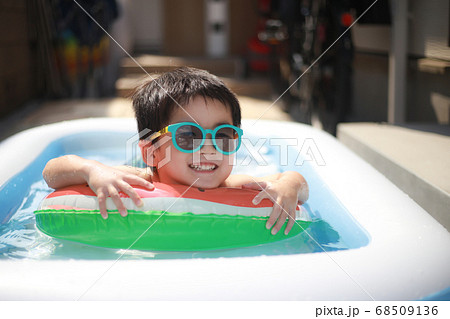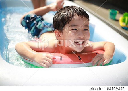ビニールプールで遊ぶ日本の男の子(3歳児)