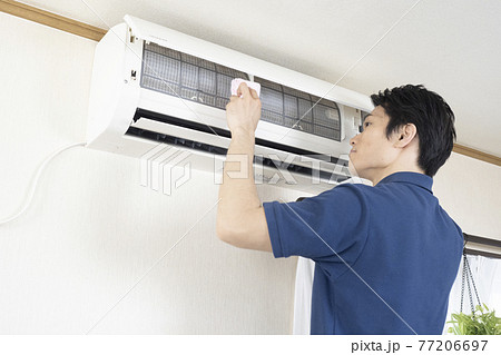 エアコンの清掃をするハウスクリーニングの男性作業員