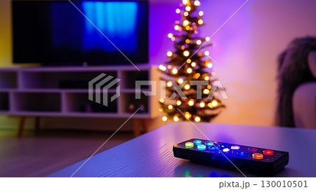 Christmas table composition. Beautiful decoration. Christmas trees, candles, stars, lights and elegant accessories. Merry Christmas and Happy Holidays, Template.