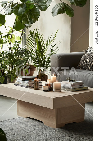 Blue Denim Jacket Drape on Wooden Stool with Black Boots and Sansevieria Plant