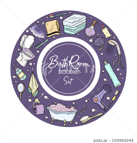 Hand drawn color Bathroom icons set. Vector illustration home bath symbols collection. Doodle sketch toilet, shower, bathtub, lavatory, towel, robe