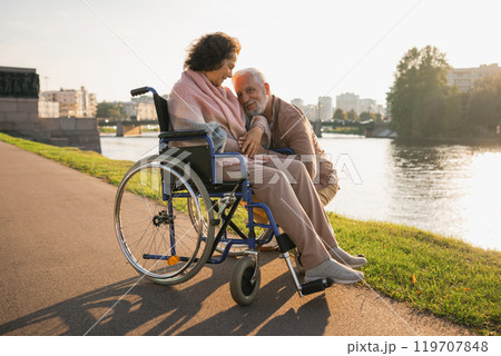 Senior woman in wheelchair walking with caregiver old man on road. Elderly family couple man supporting taking care of paralyzed woman in chair for people with disability outdoor. Rehabilitation