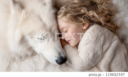 子供と犬が一緒に眠るシーン