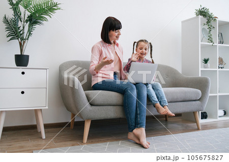 Online schooling for children. Homeschooling with computer resources. Mother's support in child's learning. Caucasian adult woman and daughter using laptop in home interior