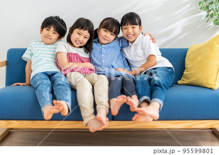 ソファーに仲良く座る小学生