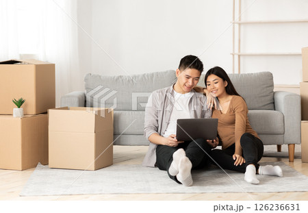 Online Ordering Concept. Asian family using laptop sitting on floor among boxes, empty space