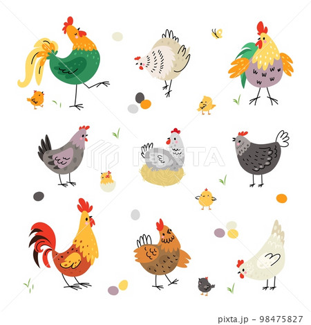 Chicken birds, hen and rooster. Poultry breeding, yellow cartoon cute chick. Farm birds in various poses, eggs and chickens. Nowaday vector agriculture animals