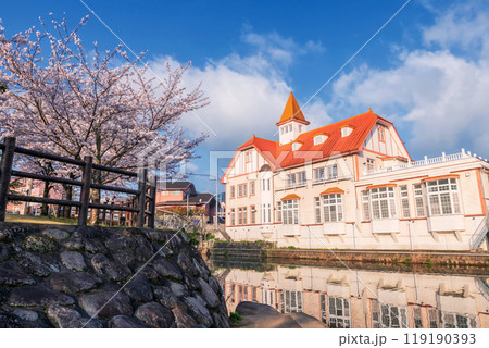 Ureshino Onsen Park with white cherry blossom at sunrise, Saga