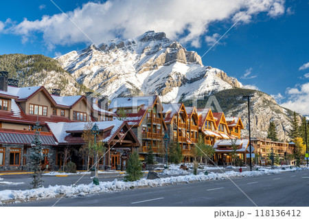 Banff Avenue in snowy autumn sunny day. Snow-covered Cascade Mountain with blue sky and white clouds in the background. Banff National Park, Canadian Rockies. Banff, Canada