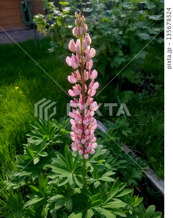 Lupins, lupin plant, lupinus, with pink flowers growing in a back garden