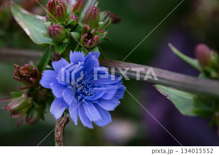 Close up of blooming blue common chicory or cichorium intybus with natural green background. Selective focus. Shallow depth of field.
