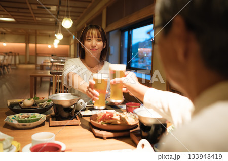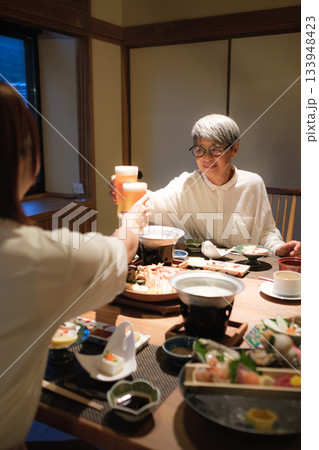 旅館の夕食で親子が乾杯を交わす温かい団らんのひととき