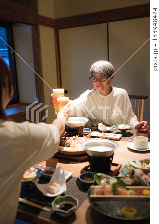 旅館の夕食で親子が乾杯を交わす温かい団らんのひととき
