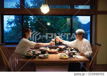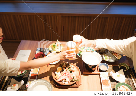 旅館の夕食で親子が乾杯を交わす温かい団らんのひととき