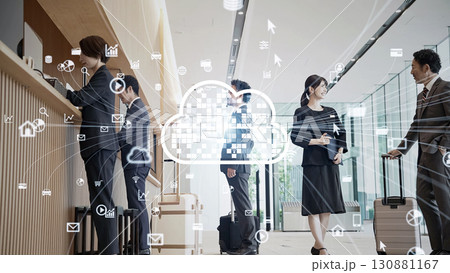 ロビーの受付に集まる人々とクラウドイメージ