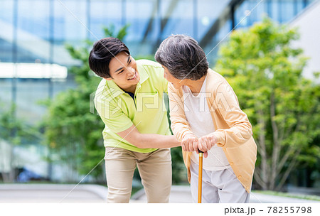 杖をついて歩くシニア女性と介護士 撮影協力:中央工学校附属日本語学校