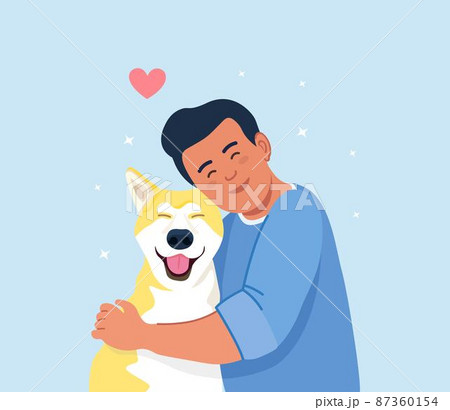 Man hug dog. Young guy hugging puppy with love. Friendship of boy and pet. Caring for a four-footed friend