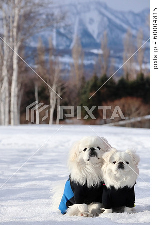 寄り添って座る白いペキニーズ