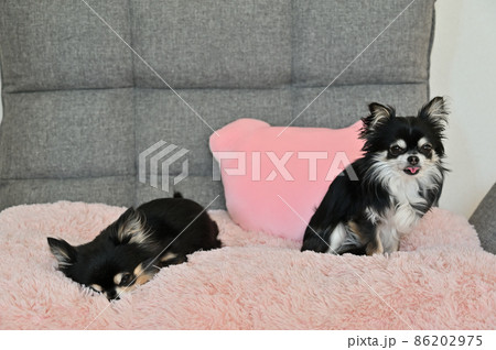 ピンクのクッションで寝るチワワと舌を出すチワワ 多頭飼い