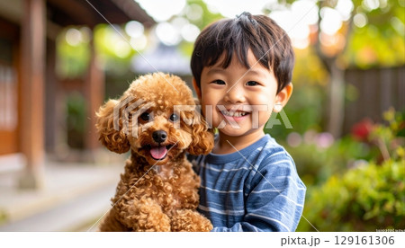 トイプードルに寄り添う男の子