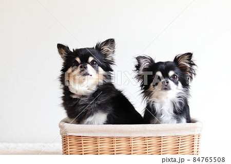 カゴに入る2匹の犬 チワワ 多頭飼い